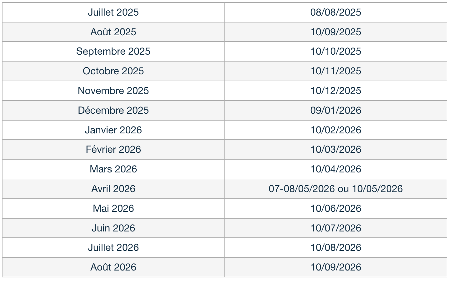 Voici les prochaines dates de paiement pour l'année 2026 :